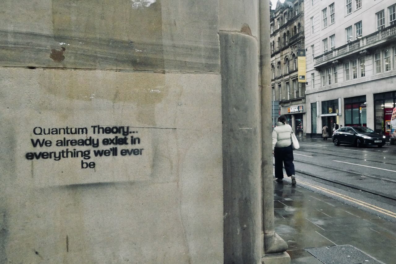 Whomever stencilled this on Cross Street, Manchester, is obviously referring to the Many Worlds Interpretation of quantum theory — the idea that whenever a decision is taken, both possibilities play out, and so all possible worlds exist as parallel universes. Which is all very well but if, somewhere, I am the King of Norway — or banged up in a concentration camp for some perceived felony or other — or having great sex with Natalie Portman on a regular basis — the “I” that exists in this reality still had to go to work on this Monday morning. Another proposition then — it is what it is.