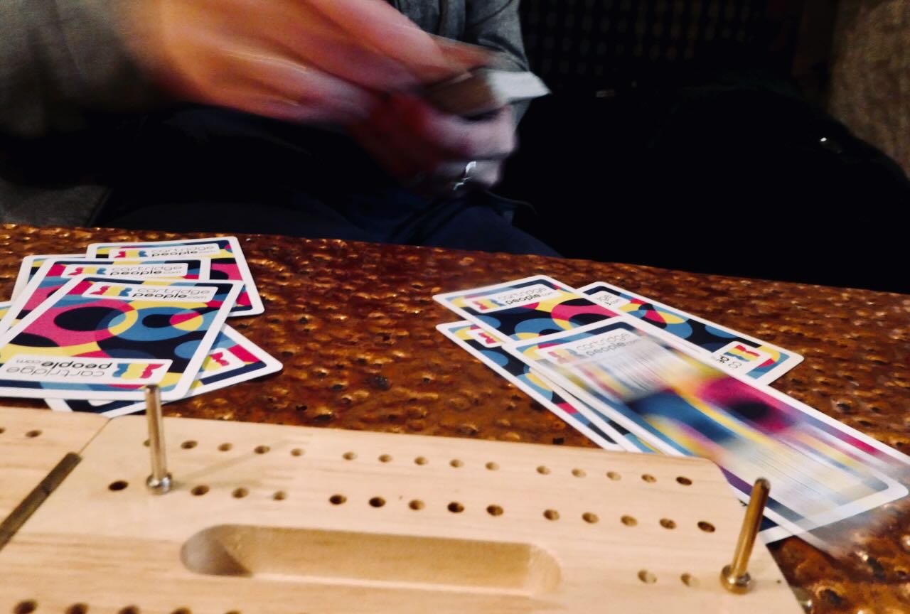 A Sunday afternoon game of cribbage. I won 3-2, by the way. As C pointed out when she first saw this, sometimes a blur is exactly the point of the shot.