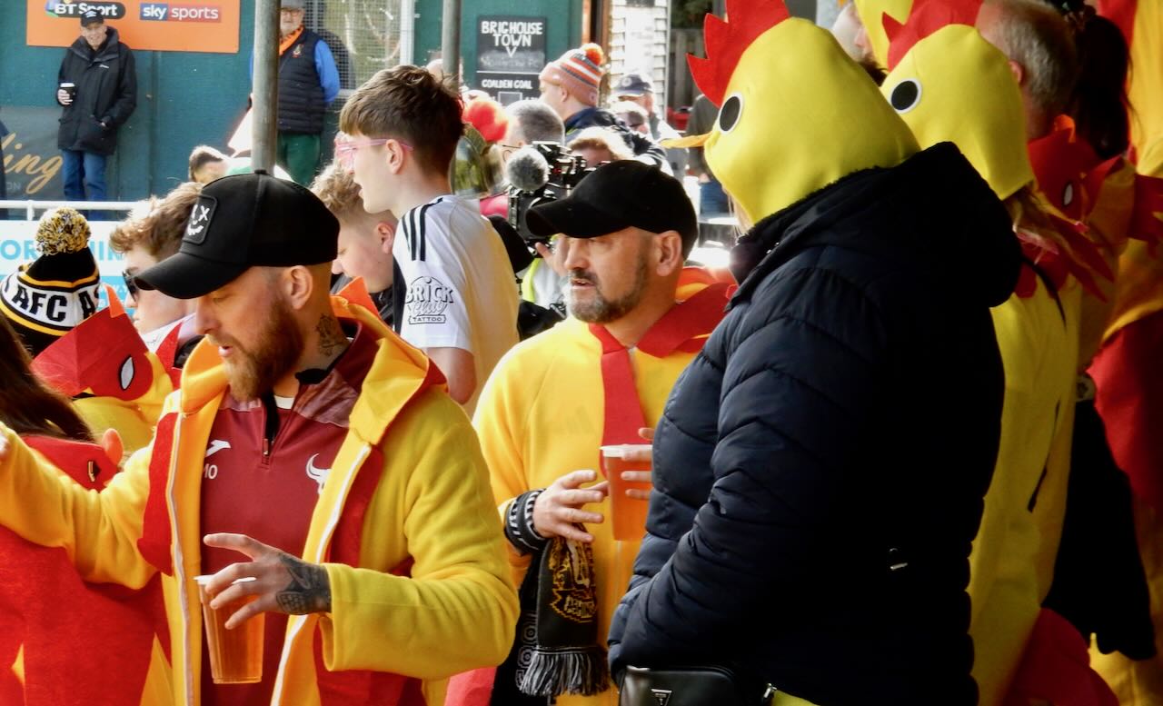 Why the fans of Ashington FC turned up at today’s game (at Brighouse) dressed as chickens is a story I was told, but in some ways it is far too tragic to relate here: let us just say that it was to do with a practical joke from the past that may have gone wrong. Beyond this you do not want to know, trust me. Connection corner: this is the second time Ashington FC have made it onto tbe blog and, as the visiting team on both occasions, they were just as successful as last time — this is also the second time that, at Brighouse, there has been a picture of a grown man dressed as a chicken. What this says about me, Brighouse Town, and non-league football generally, I know not.