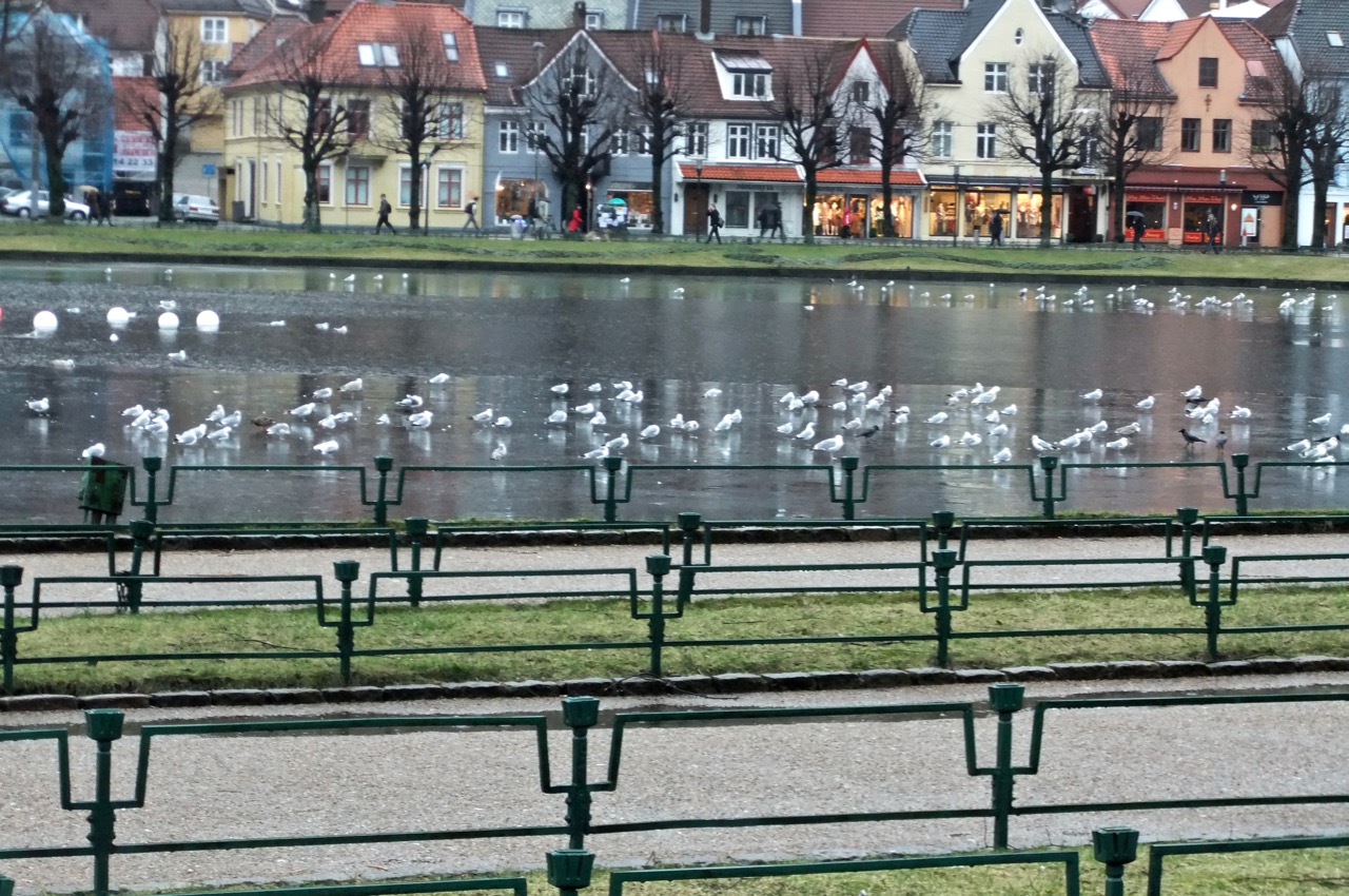 This is an artificial lake in the centre of Bergen, by the art museum. It’s actually not that cold here (although the weather was still revolting today), but there’s still this scrim of ice on the surface of the lake, enough to support these birds’ weight and provide a nice optical illusion effect to add to the other nice patterns and colours on this shot.