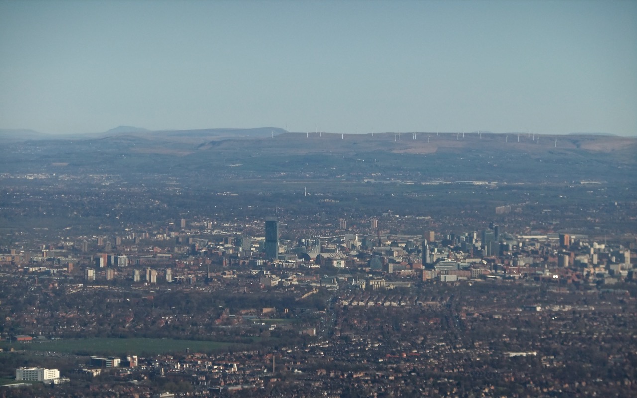 Whereas yesterday’s picture encompassed a range of, say, about 50mm, I guess this shot covers a range about a million times wider (that is, 50km). This is the view I got this morning as my plane took off from Manchester airport to the south of the city. The prominent building just left of centre is the Deansgate tower (a Hilton hotel on its lower floors, residential apartments above). The main city centre is to the right. The university will be on the edge of where the high buildings start, just to right of centre.