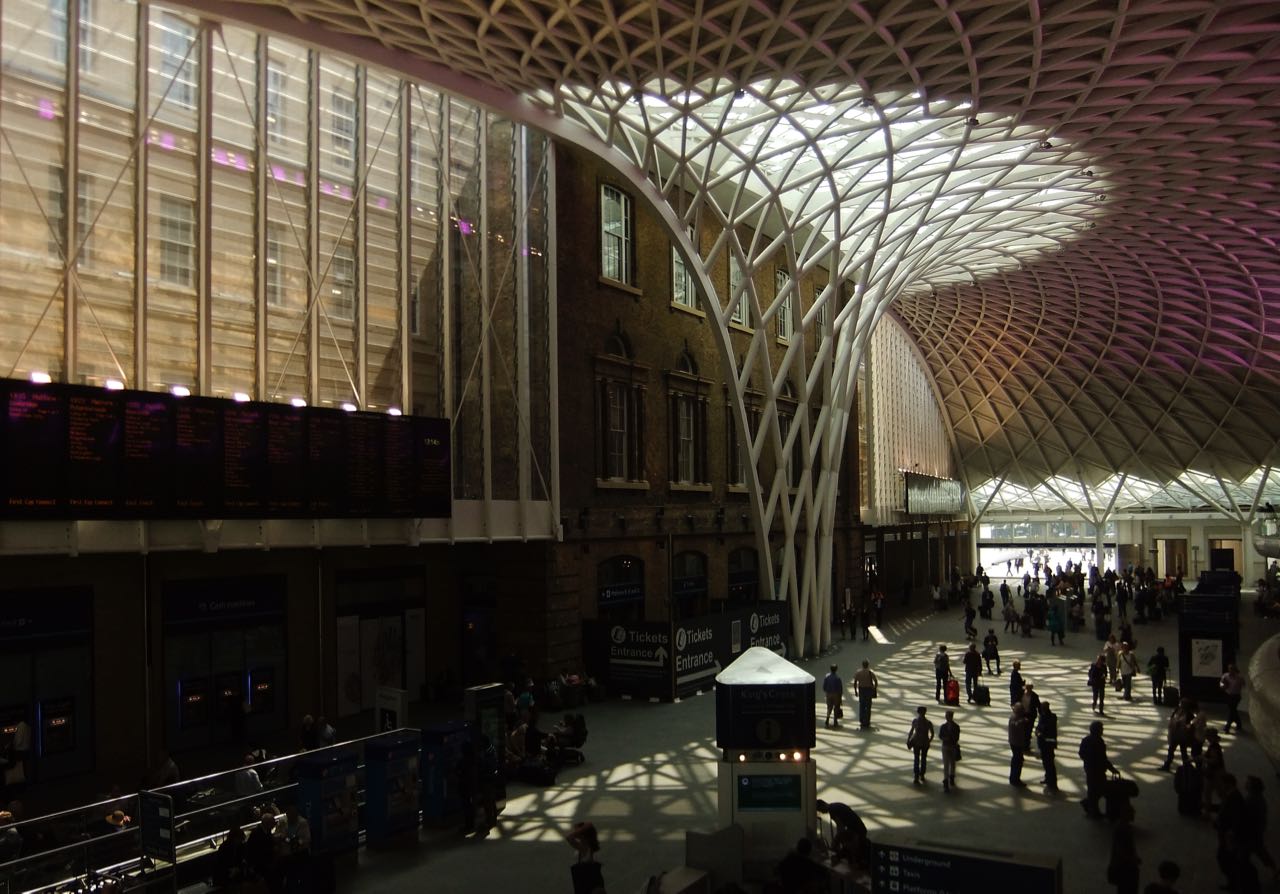 This is the new entrance at King’s Cross station in London, opened in March. I’m very impressed with it. Apart from looking damn good, it also has some nice cafes on the balcony which do not charge ludicrous prices for cups of tea (£1.50 for a cup, which is quite reasonable these days), and a good pub, which seems as if it has been there for decades. And there’s a Platform 9¾ sign (complete with a luggage trolley half-sticking out of a wall) to keep the Harry Potter fans happy.