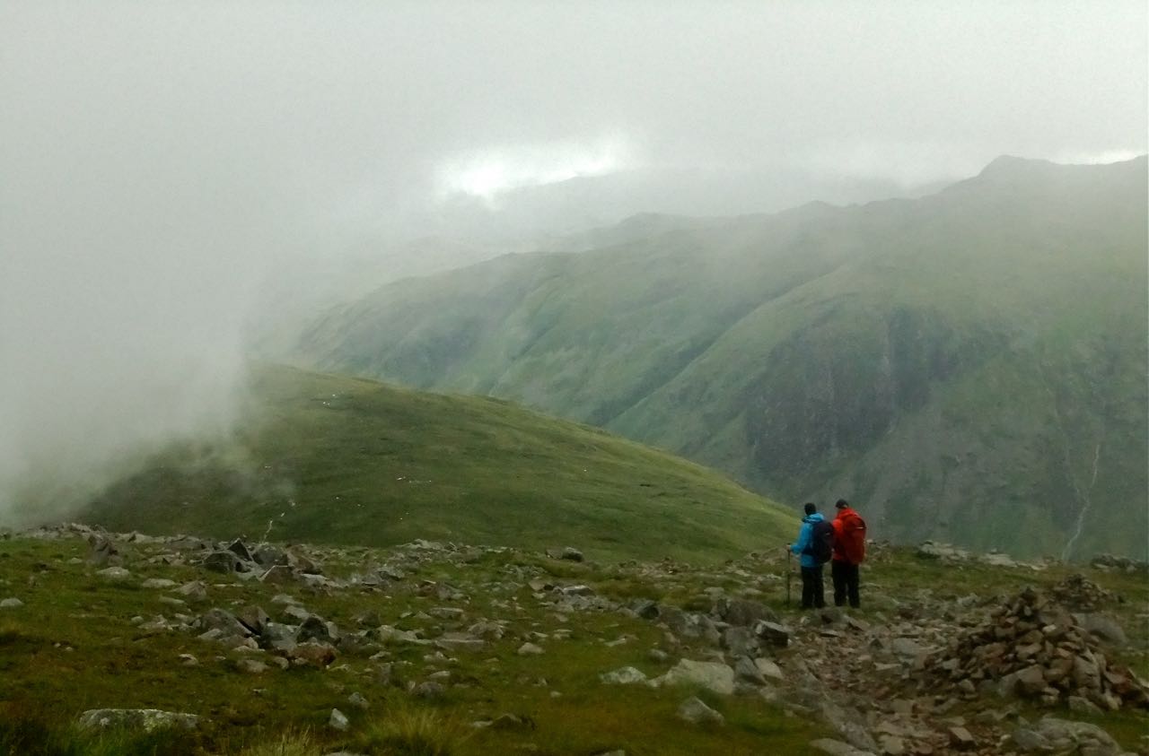 However, I put a ‘landscape’ photo up here to draw attention to the other big theme of today – the bloody weather. Honestly. Most of the rest of the country had a good day today, but I can assure everyone that on the tops of Kirk Fell; Great Gable; and Green Gable, between 9am and noon today, it was revolting. I found it quite dispiriting and didn’t enjoy the walk until it was finished, when I had a sense of achievement. Base Brown was the fourth fell of the day, and I and these two other walkers watch as it stops having its rare moment of clarity and the big devouring cloud beast comes in again, just as we thought we might dry out for a few minutes.
