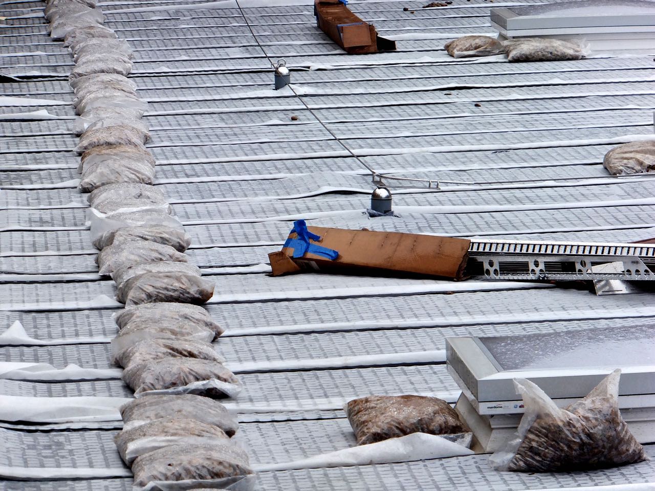 A day working at home. The turf roof that has been promised for the Nutclough Mill extension has moved a step closer, it seems, with the delivery of a whole bunch of stones (in bags here) that presumably will form the ‘bedrock’.