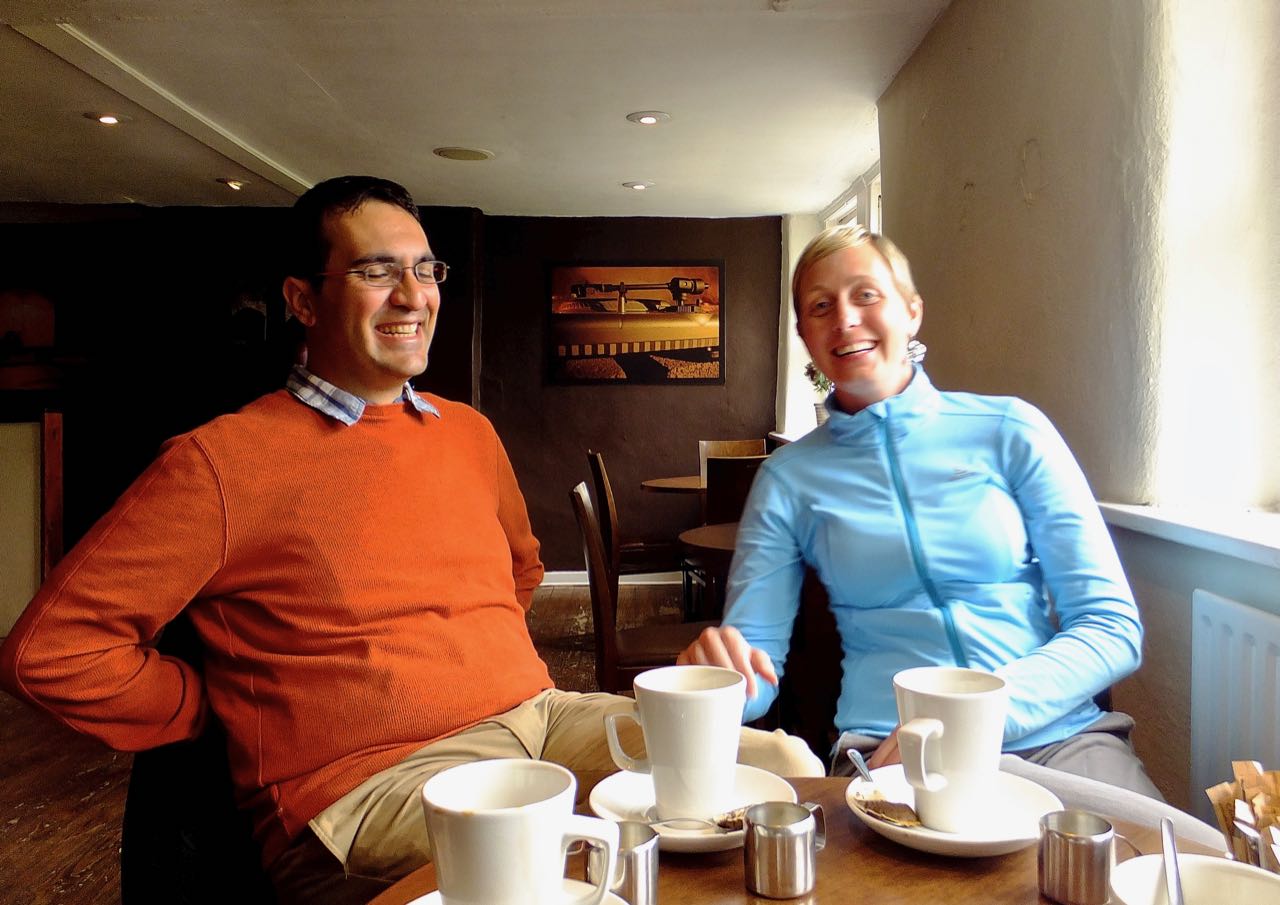 George is originally from Cyprus and his wife Kelly, from Minnesota. They had been living in Austin, Texas, but have recently moved to Vancouver Island, Canada. He used to work with me at the University of Manchester and was passing through Hebden Bridge (England) today, on their way to fly home, from Scotland, so we met in the morning for tea.