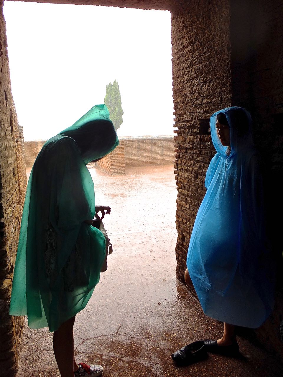 The latter was worth visiting but notable for being the place where we were caught in a severe thunderstorm for an hour or so, which is when I took this shot, of these two Chinese women in their waterproof ponchos (being touted at €5 each while it was raining), in the first of the two spots in which we tried to avoid the rain. I like the strange positioning of the hand of the one in green, and yes, her friend is standing on one leg at this point.