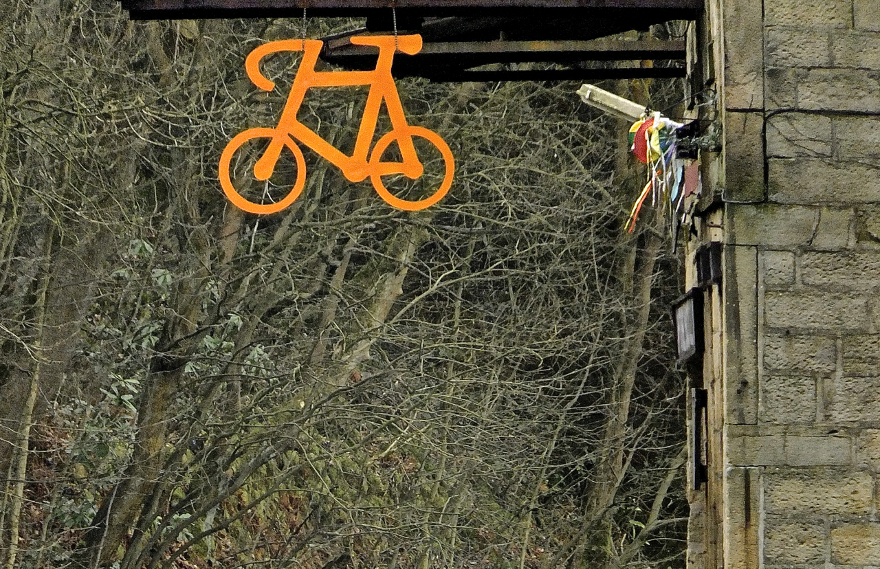 After a cold and snowy few days in Norway, back home, to a less snowy but still cold Hebden Bridge. The bicycle hanging by the canal is a legacy of when it was much warmer, back in July, and the Tour de France came zipping by.