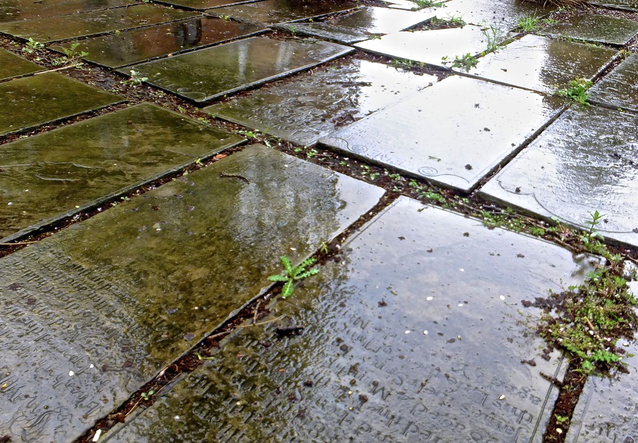 The St Thomas’ Centre, where I did some work today, is a converted church, and its front yard is paved with these grave markers. Which would have made an excellent photo had it not been hurling down with rain whenever I was outside: the wettest day in months, actually. So, bad photo alert. Sorry.