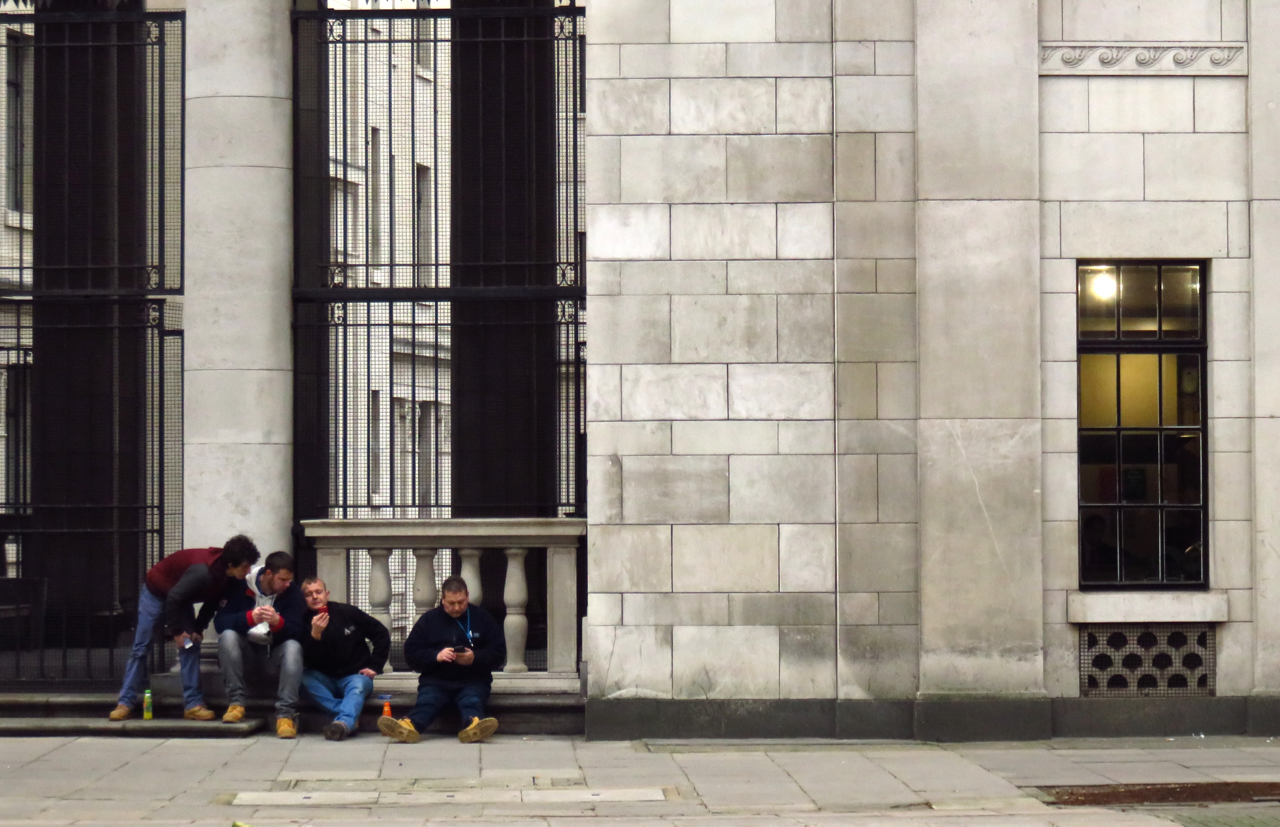 So many advantages to coming down last night instead of this morning — no 5.30am alarm call, and the chance just to amble through London streets and see what came into view. The monumental Bush House belongs to the London School of Economics, but I was just passing. I love the tableau made by these guys. Is the one on the right missing out?