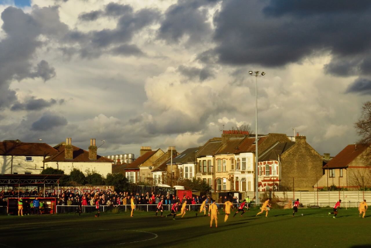 With nothing else much to do while Clare was on her course today I took myself on the latest stop on my recent tour of obscure football stadia and took in a game from the Essex Senior League, Clapton v Barking. Clapton are notable for having a big ‘Ultra’ fan group, but they are a club with a history, having been founded in 1878 and still playing at the same ground they always have done, the marvellously named Old Spotted Dog stadium. The result — Clapton (here in red, white and black) 4, Barking 2. Better than my lot managed today anyway.