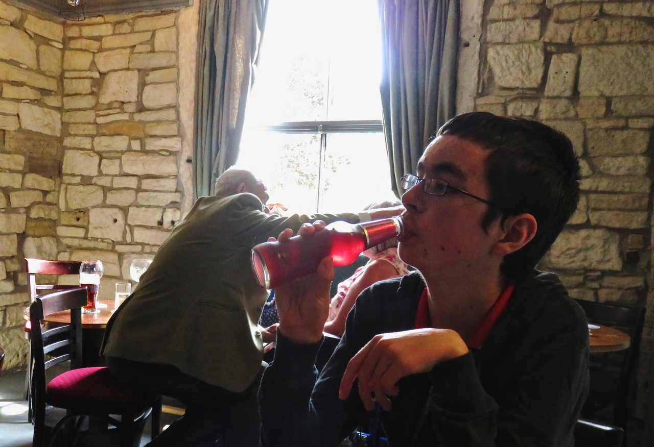 Joe’s first appearance on this blog was on its 9th day, September 3rd 2011, in which he was pictured in this room doing much the same thing as here, drinking a fruit juice (always still — Joe doesn’t do fizzy drinks). He — and the room — look somewhat different now, 2,094 days later.