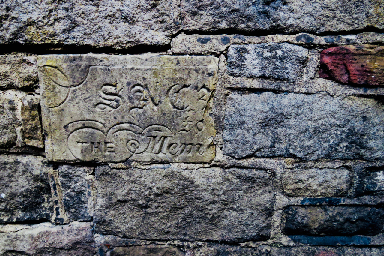 This wall has been around for a while, separating the beer garden of the White Lion (the oldest building in Hebden Bridge) from the river. When this wall was built, or last rebuilt anyway, the supply of stones must have been a tad short that day. Whomever this headstone was ‘Sacred to the Memory of…’, let’s hope their spirits aren’t still hanging around to get pissed off.