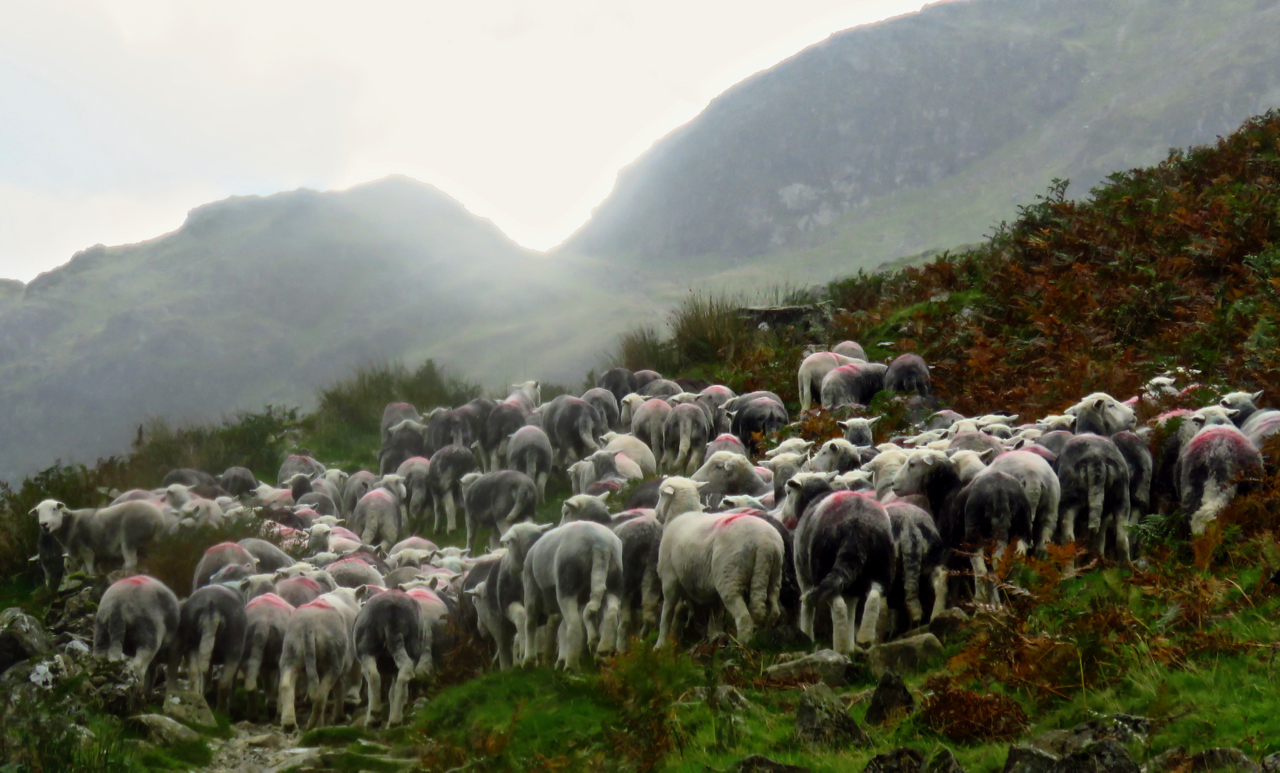 The weather was mostly good over these two days and only in the final hour or so was there some drizzle. This came down while I descended, aching and exhausted, from Scarth Gap (the notch in the hillside above) to Buttermere, while these sheep all went up the other way. There is a shepherd and dog just out of shot to the left. I did get some shots of them all coming up towards me as well, but this is the best one.