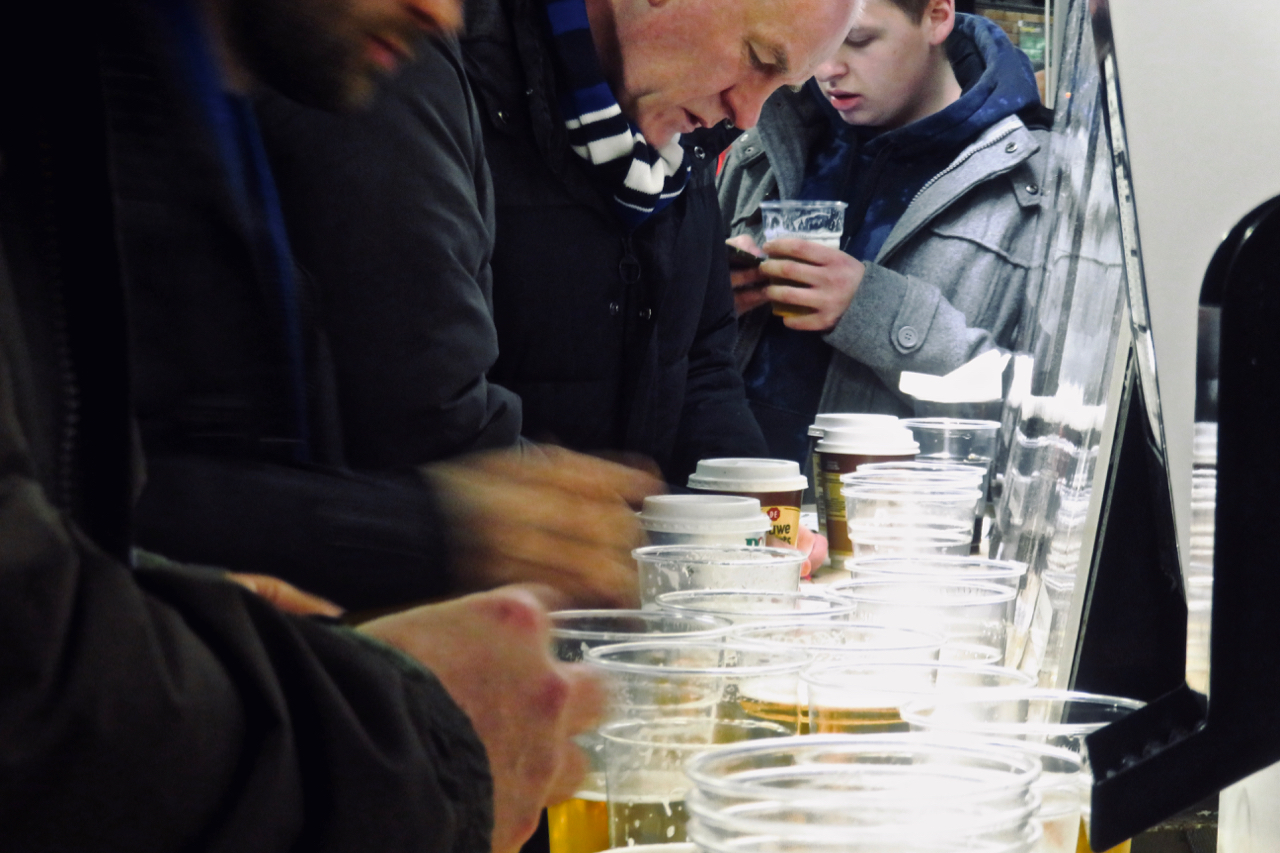 Before a match at the “Theatre of Dreams”, no less — Old Trafford, home of Manchester United. But this being a ‘big game’, photography opportunities were limited due to not being able to move around, nor, indeed, allowed to bring in a camera any bigger than a small matchbox. This is taken with my old compact rig. I guess I just like the beer (plastic) glasses lined up…. beer and gambling, things to do on a Saturday afternoon (I don’t bet, myself).