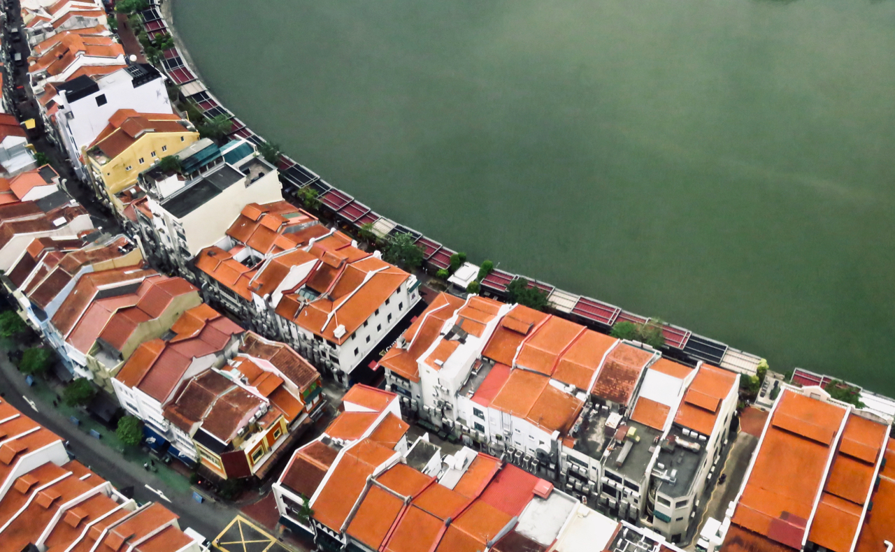 Boat Quay is that bit of Singapore that you come to if you are happy to be enticed into one of at least thirty pubs, cafes and/or restaurants that line the riverside: the corrugated iron rooves that cover the al-fresco tables are clear on this shot, taken from 33 floors up. It’s a good-looking city in fact: and far more attractive than Dubai.