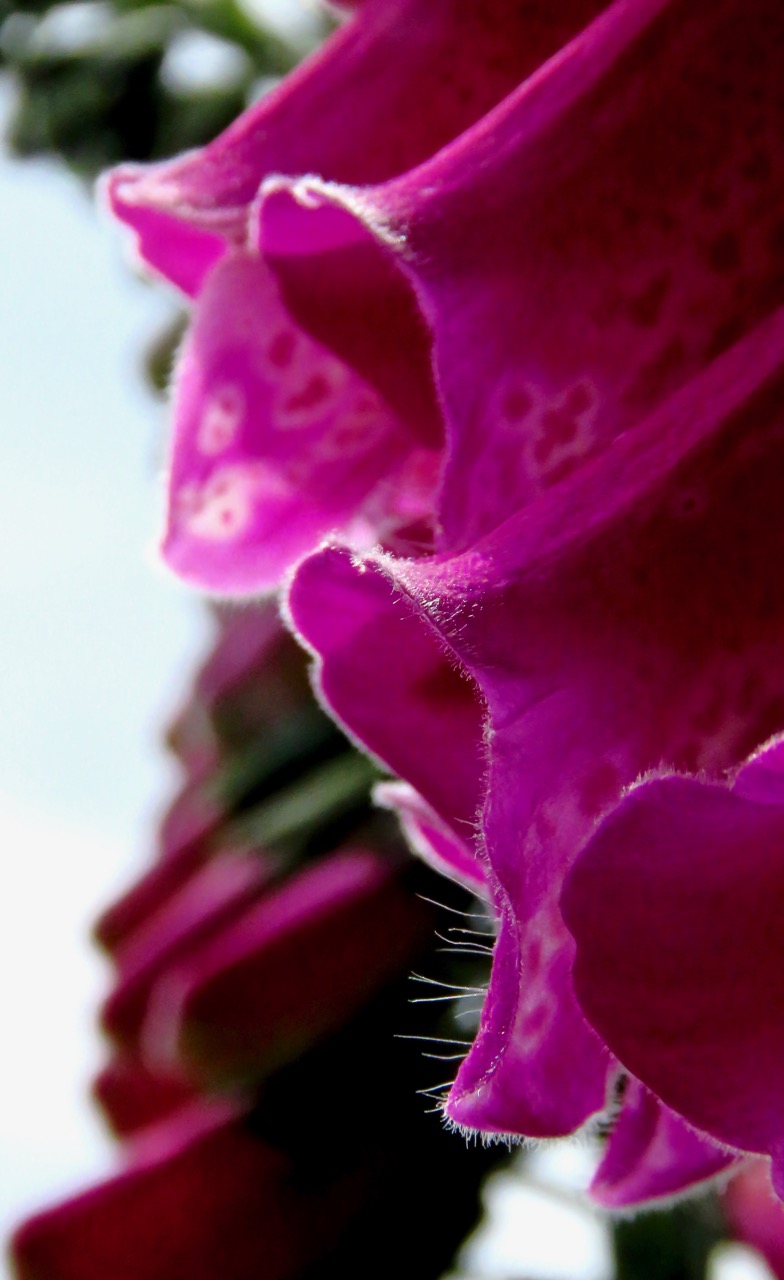 Digitalis purpurea, the common foxglove, always brightens things up at this time of year. Both its Latin and English names come from the way the flowers slip perfectly over one’s fingers; but as bees like to crawl up them too, don’t try this without checking first.