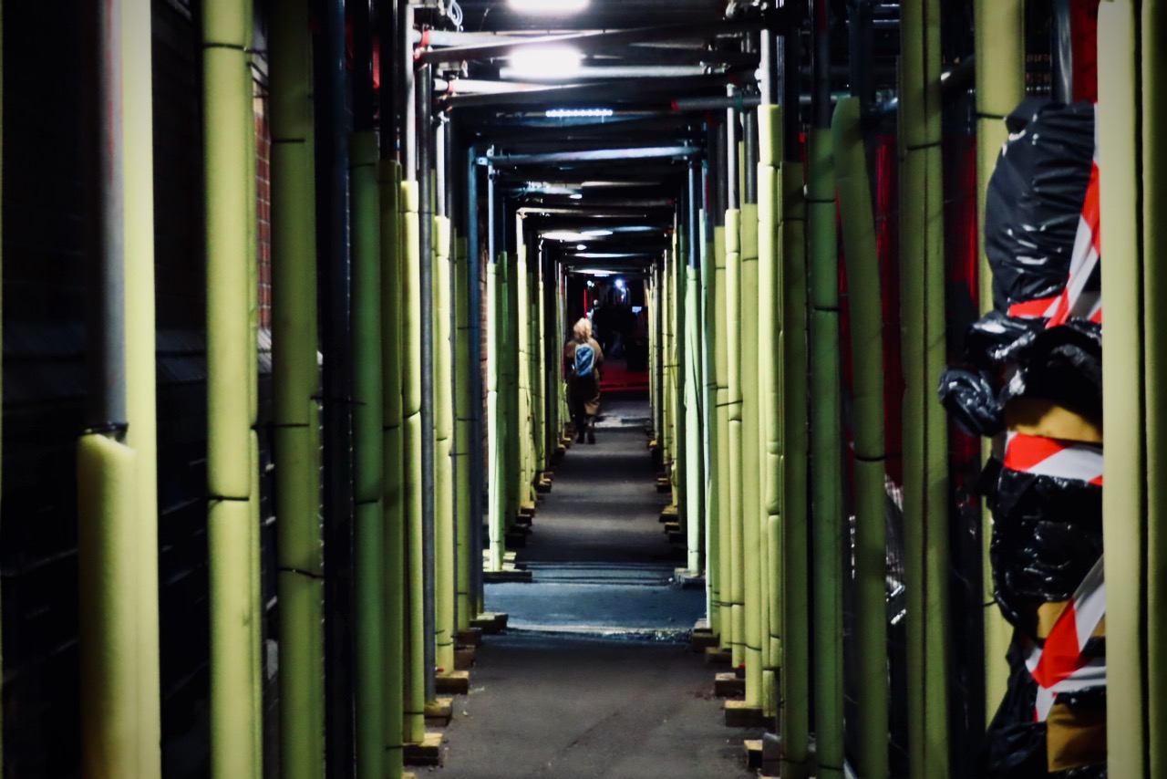 The endless building and rebuilding of Manchester does not seem to have particularly slowed down as a result of the last two years of bollocks, although seeing as no one has any money any more except Mark Zuckerberg it seems, I don’t know who’s going to inhabit all these new buildings. This scaffold tunnel rises over my walking route to work and I’ve been passing through it in both directions for some months, thinking it would make a decent picture; this evening it gets its chance.