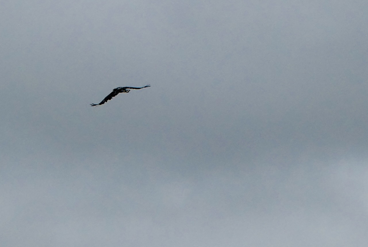 Back in 2012, in the Lake District, I pictured a vague blob in the far distance that may or may not have been a golden eagle. But this one is definite. You may, of course, live in a part of the world where these noble creatures hang out on street corners, but that’s not the case in Great Britain — except, it seems, in the far north of Scotland, where this huge bird took off from some trees nearby as I passed and flapped lazily overhead for a while. Until uploading the pic later and checking the details I wasn’t sure of the species, but the wingtip feathers are the giveaway: an eagle it is.