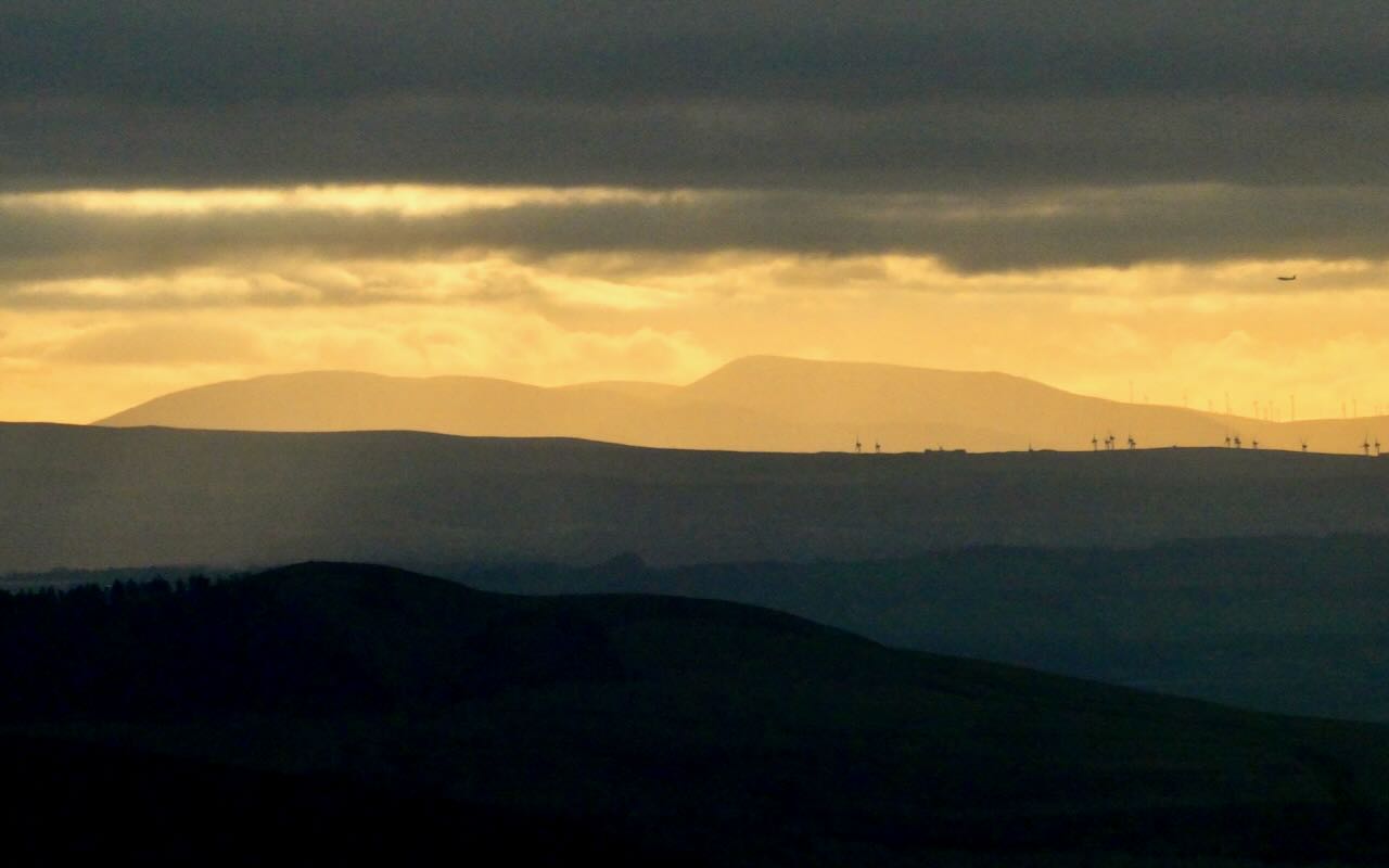 Boxing Day was spent walking in the Ochil Hills. Grey skies above us were contrasted with the sight of sun shining on hills to the south. This shot, from the summit of Innerdouny Hill, was taken with a very long zoom, and I am prepared to state that what is seen here is Culter Fell, the 2,454-feet high summit of South Lanarkshire — it’s in the right direction, and it certainly looks like it (see the second image down on the page as linked). Which means that here we have a view of just under 50 miles. That’s impressive — but in the end, I pick the shot because of also capturing the aeroplane, which is just cute. (More pictures from the walk will appear on my other blog in due course….)