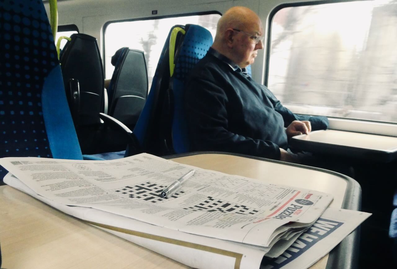 I was about to post a picture of the year’s first cherry blossom in Sackville Gardens, flowering above the seated statue of Alan Turing, but then I realised I had done exactly the same in both the preceding Februaries (the evidence is available at this tag). I would still like to avoid such repetition if I can — for my own self-satisfaction if nothing else — but I spent all day in the office and didn’t really capture much else. Bloke on Train with Someone Else’s Half-Completed Crossword is my best alternative. But I guess it at least records a trip to the big city. With a comfortably late start (thanks to teaching until 6pm again).