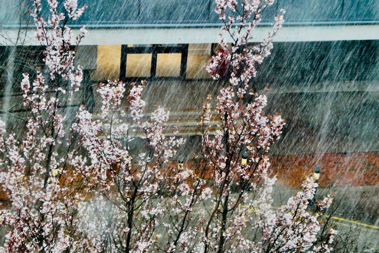 Typical behaviour for the British climate — balmy weather on Saturday, revolting wintry crap the following Wednesday. I have to wipe off a layer of hail each time I come inside today. The blossoms bear it stoically.