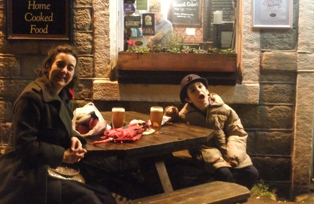 I think I must still have been drunk when I picked the representative photo of New Year’s Day: what an atrocity, the choice so far that I most regret, I think. This one is much better, don’t know why I didn’t pick it. It also encapsulates the fact that it was so mild that night we could sit outside on our way home from the party. (That’s my beer in front of Joe, in case you were wondering.)