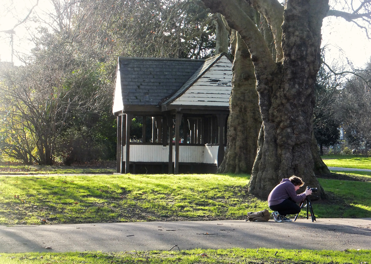 The shelter behind him featured on the shot I did choose from a pleasant morning in this park. What his shot turned out like, I do not know — he seemed to be taking it of a friend planking on a nearby fountain.