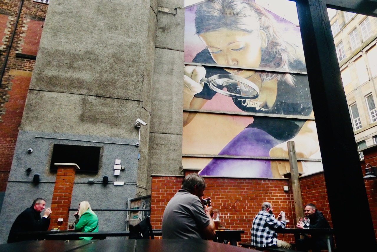 I took a picture of this mural on a visit to Glasgow a couple of years ago, but didn’t use it at the time: in fact, the one I took then was possibly better as from outside the pub courtyard we see her left hand coming down to pick up little insect-like pedestrians on the street. But from the courtyard of O’Neill’s pub the ‘Girl With a Magnifying Glass’ (look it up on Google Maps) seems to be inspecting the drinkers, somewhat scientifically…