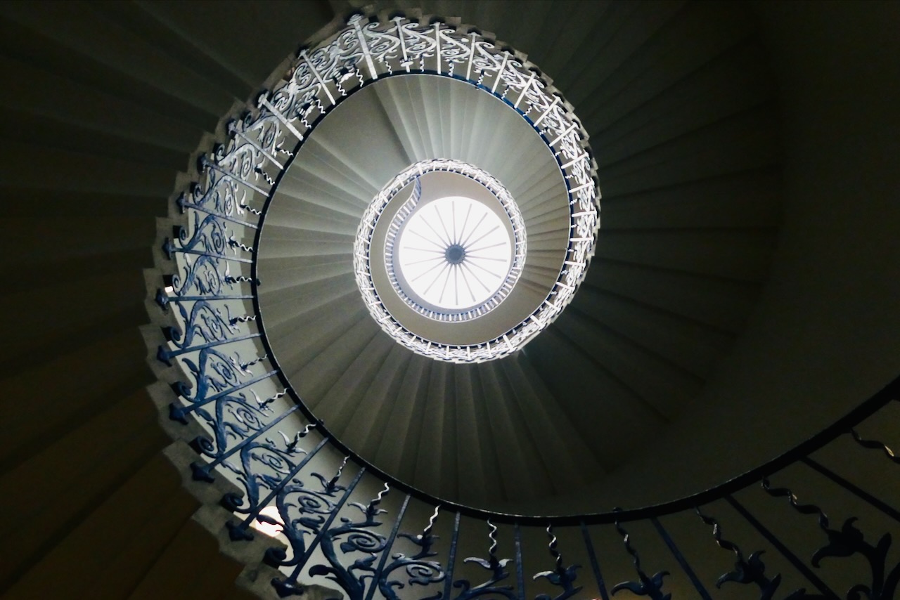 Queen’s House in Greenwich, London was built by Inigo Jones in the 17th century. As he was rather good at this kind of thing, it turned out to be an architectural masterpiece, bringing classical style to English architecture for the first time. The Great Hall is a perfect cube and this staircase — the first ever built in the country that lacks a central pillar — is just gorgeous. (Although not quite perfect, do you notice? There is a wider step up there forming the landing of the next floor up, and the spiral ‘kinks’ as a result.) Apparently it ‘holds itself up’, meaning that the steps cantilever out from the wall and the weight of each is supported by the one below, and eventually the ground.