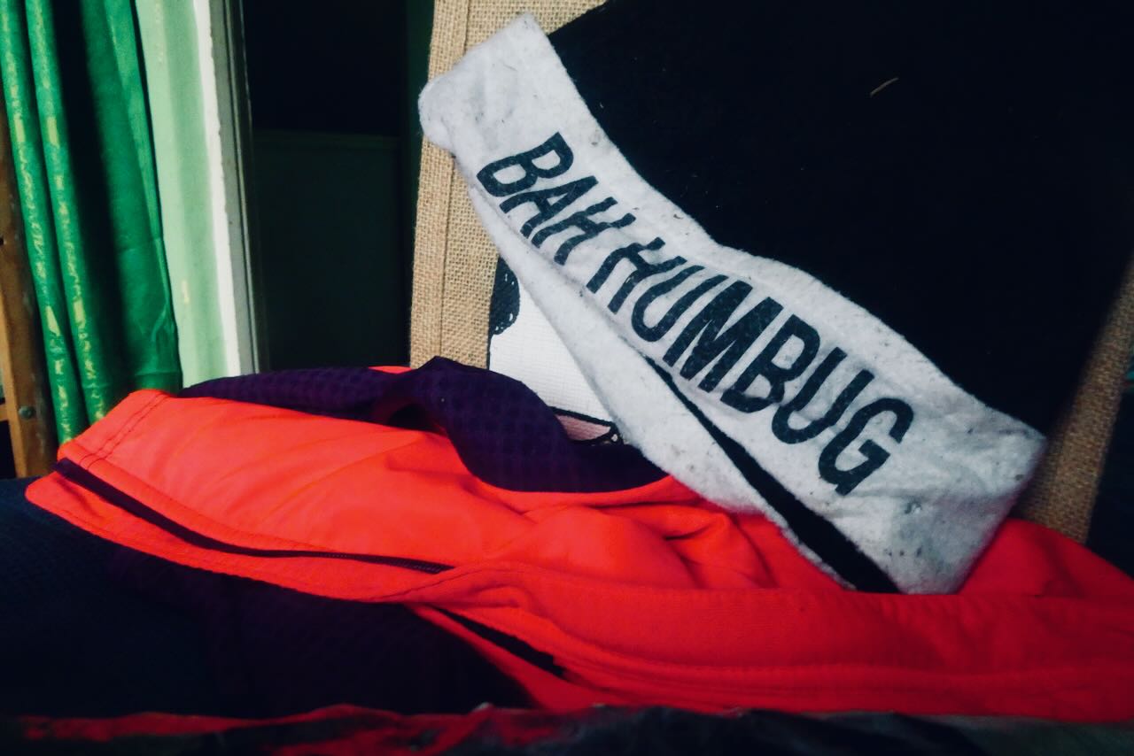 The hat with the Scroogey message has been hanging around the house for years, having been acquired from I-Don’t-Remember-Where. Here it is added to a pile of gear C was intending to wear to the first in a run of her Christmas parties. Her excuse could be that it’s the only suitable headgear in the house, but that, in itself, says a lot about why it still sees use.