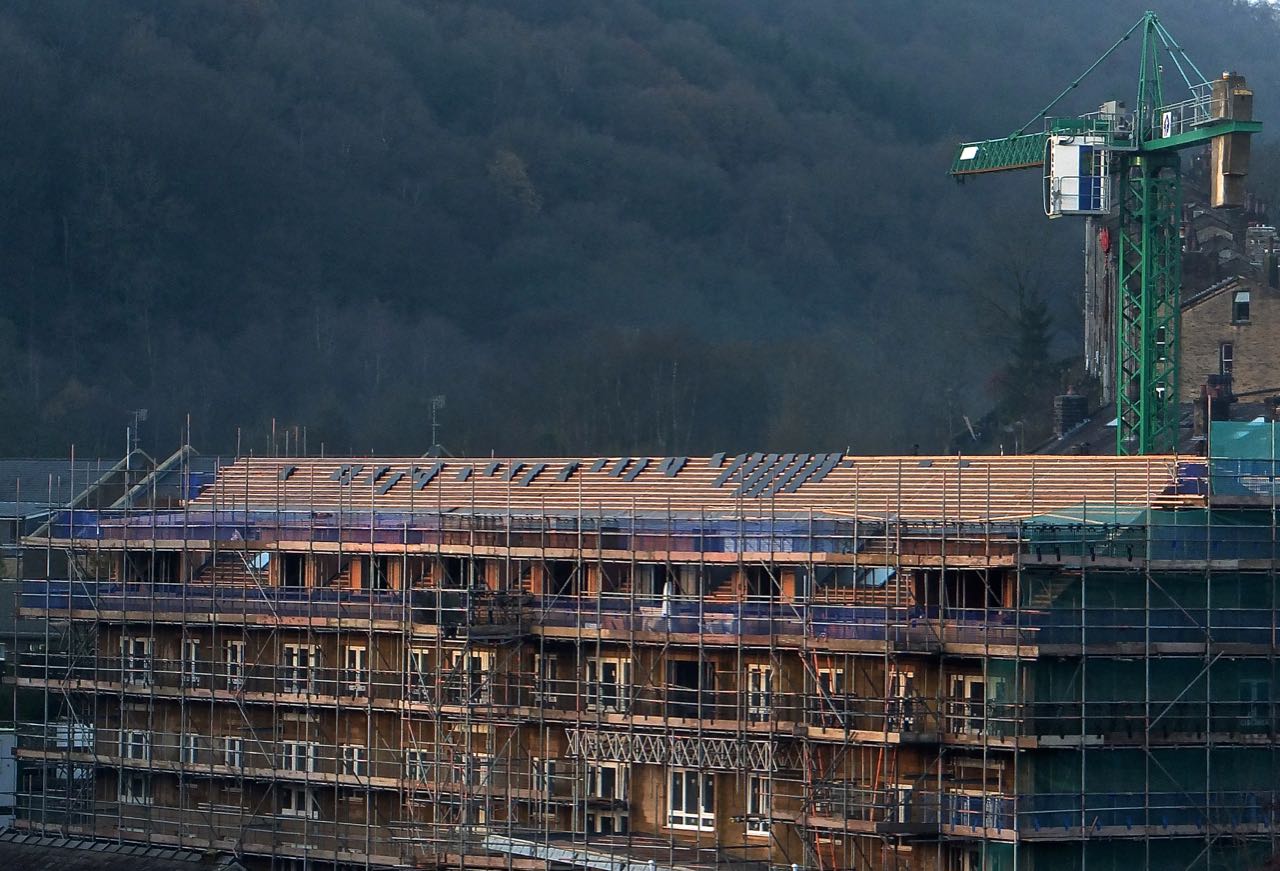 This is the building site that children should not play on (as pictured behind the playground equipment a couple of weeks ago). A burst of sunlight caught it very well this afternoon.