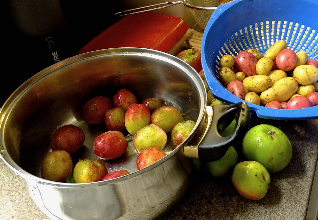 Two decades of working the allotment has proven that fruit is so much easier to handle than vegetables. The plums and the various berries (black, blue, josta, logan) have all been and gone. But here is just a small portion of the last crop of the year. Anyone want some apples? We will have too many.