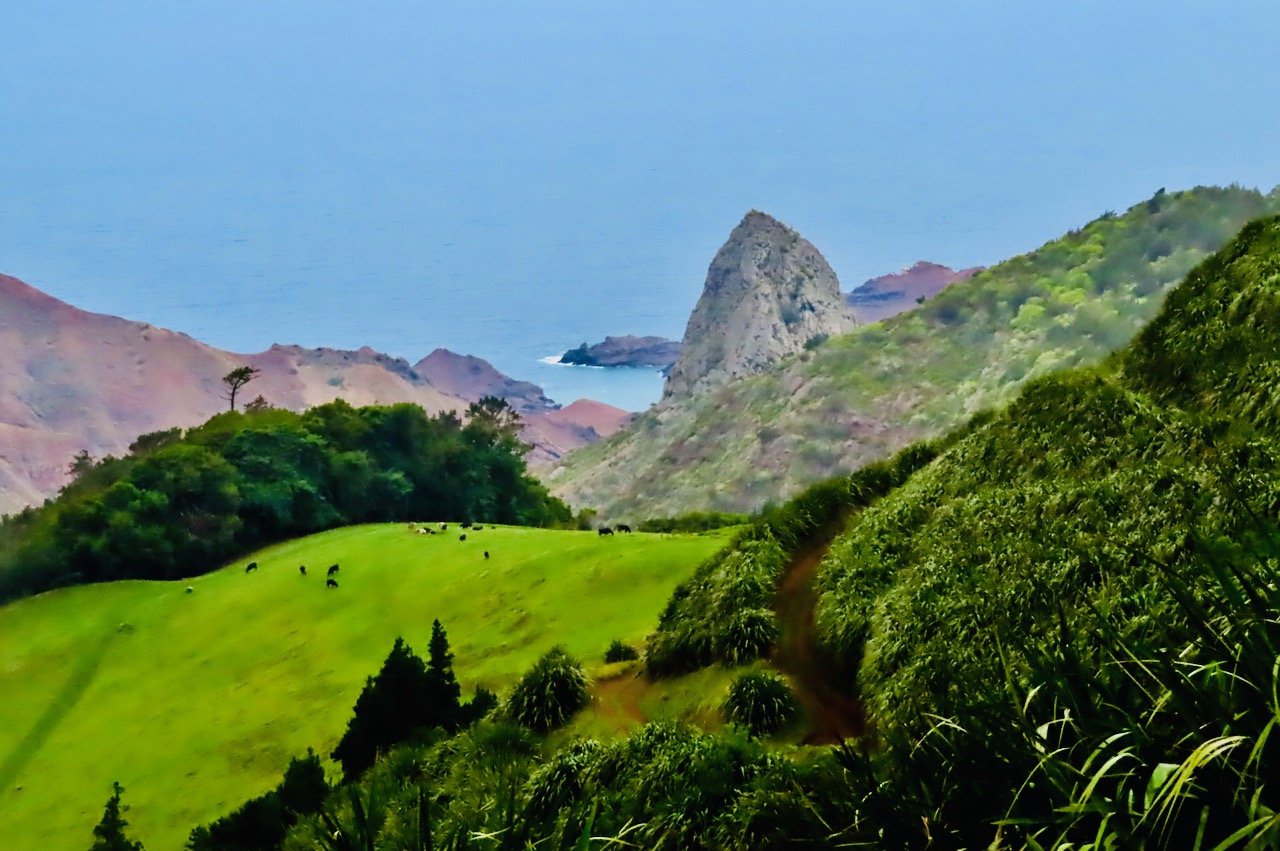 The spectacular scenery of St Helena is enhanced by the fact that the pattern of vegetation one sees in the UK is reversed. It is the coast, the lower levels, that is rocky and barren, and the mountains which are covered in lush vegetation: all down to the fact that the rain falls high up, but not low down. This is taken from the Blue Hill area, looking down to Sandy Bay, past the basalt pillar known as ‘Lot’ (and his wife is somewhere over to the right of this image).