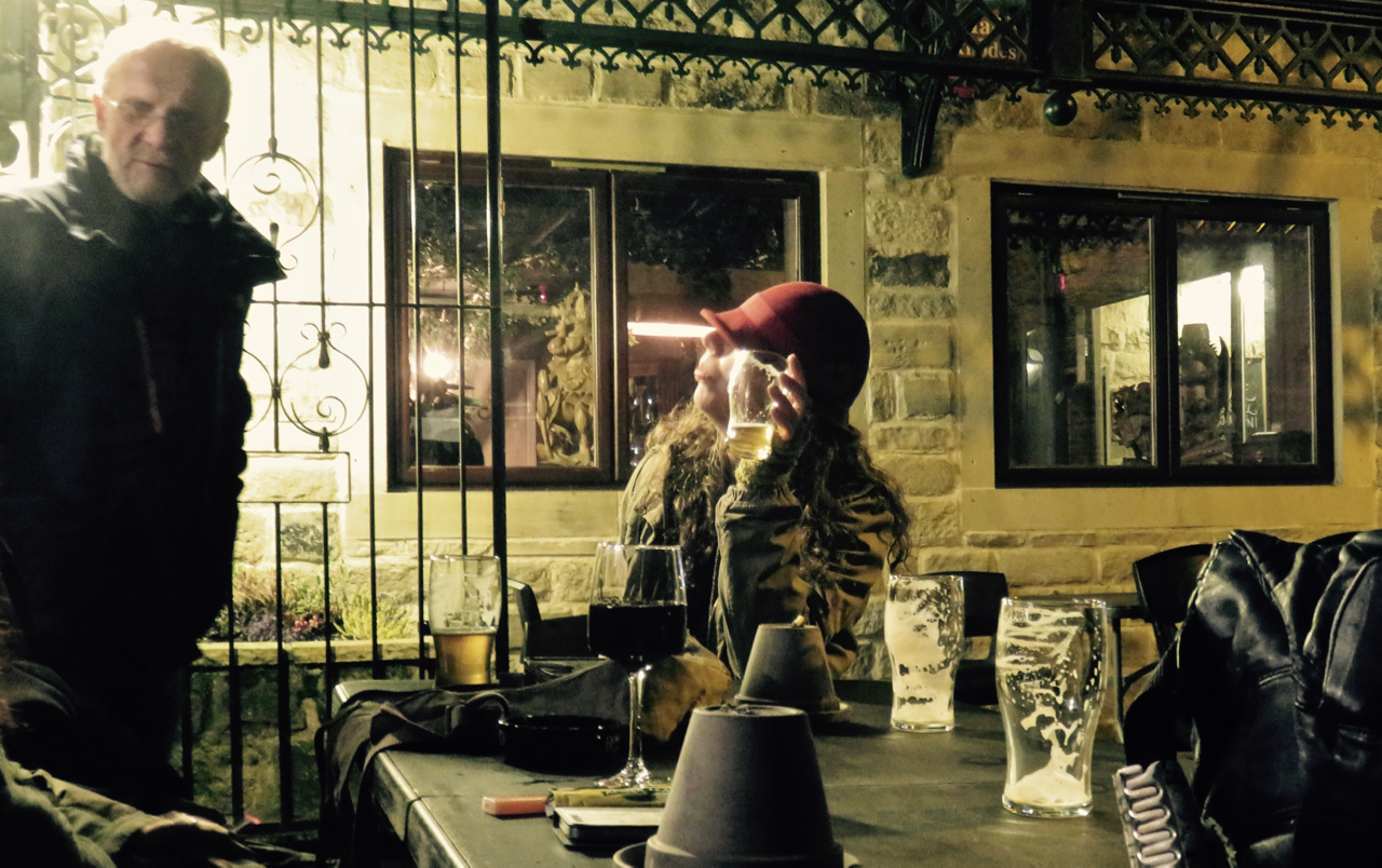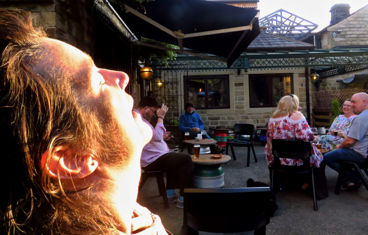 The end of a week, and some relaxation time was definitely called for. This one spot outside Calan’s holds the sunshine for as long as is becoming possible at this time of year, as the days decline. Clare makes the most of this, even though (and she did pre-approve the use of this pic) it does make her look like she is sporting some fine sideburns.