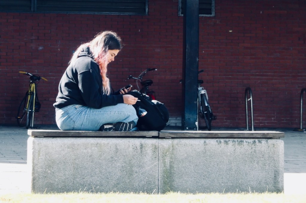 My last scheduled day of on-campus teaching in this academic year. Very few turned up, but that’s OK, it was an optional class. Hopefully they are all off in studious contemplation somewhere, like she seems to be: although quite probably she’s just checking social media while she has her fag.