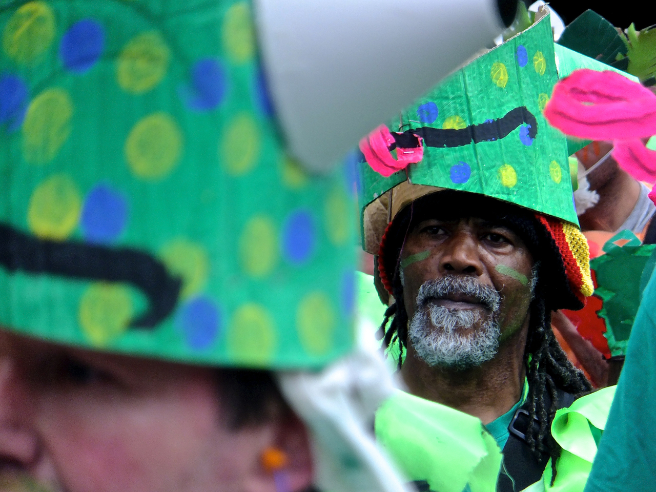 I took 89 photos of the parade within the 17 minutes it took to pass me; so to pick just one was very difficult. That being the case, interested parties could look at the top 20 pics, on my Facebook site. But I pick this one for here mainly because of the happy smile of the central model and the fact that this was the only picture of all the ones I took which I felt worked despite the fact there was a spectator firmly in the background. For some reason, it just seems to work with him there. We were all in it together, so to speak. And for just a short time we forgot the floods and the rain and just enjoyed the spectacle.