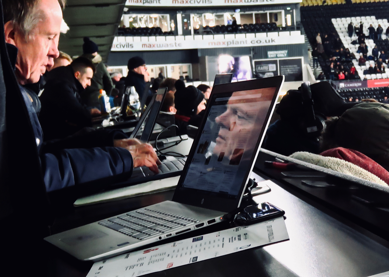 Work to do tonight in my occasional moonlighting role as a football journalist, seeing me in the press box at Pride Park, Derby, and afterwards, with work to do to make a crap game of football (Derby 0 Stoke 0) sound interesting. As did these other guys, many of whom exuded a sense of ennui about it all. Does it matter that the principal subject of this photo is not reflected in the screen of his own laptop? If so, well, that’s just the way it worked out.