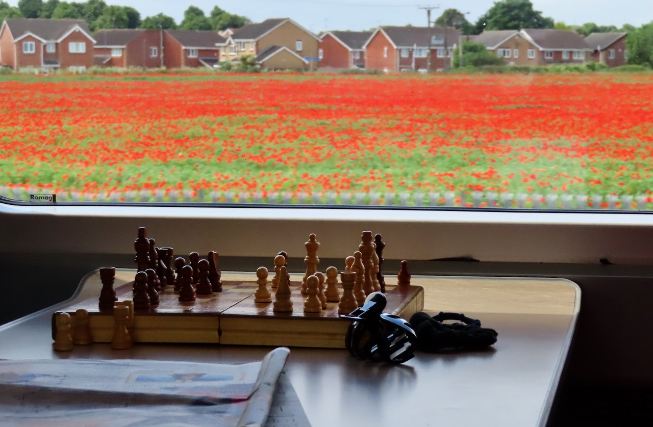 On the move again. A scene on the train to London, where I will be for the whole week to come. The field of poppies outside — somewhere near Doncaster — was so extensive that I had time to see it, get the camera out, set up the shot and still capture it OK, despite moving at around 75 miles per hour at least. I believe black won the game in the end.