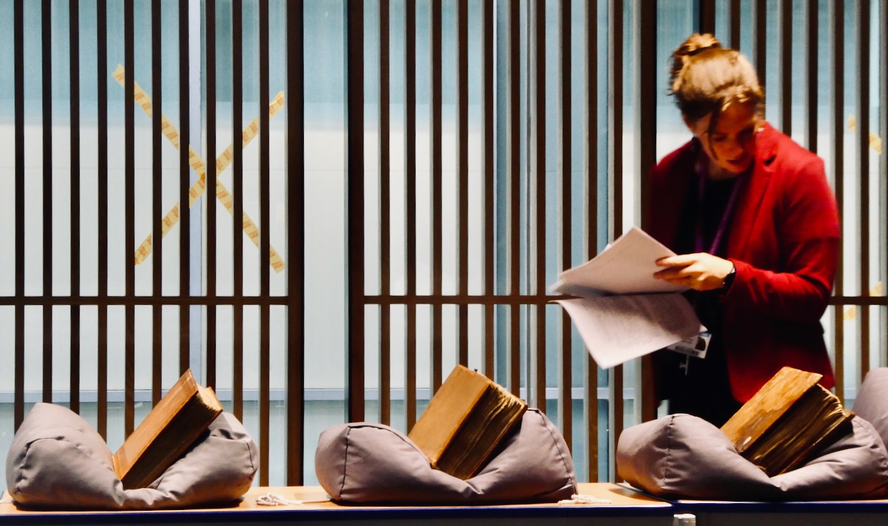 Another one of my Palaeography classes in the John Rylands Library. We have moved from Hogwarts (the old reading room) upstairs and into the new seminar room, with tape still on the windows. Checking out the manuscripts themselves is always the best bit, and they need to be ready, and cared for — would that students got to sit on such comfortable-looking cushions.