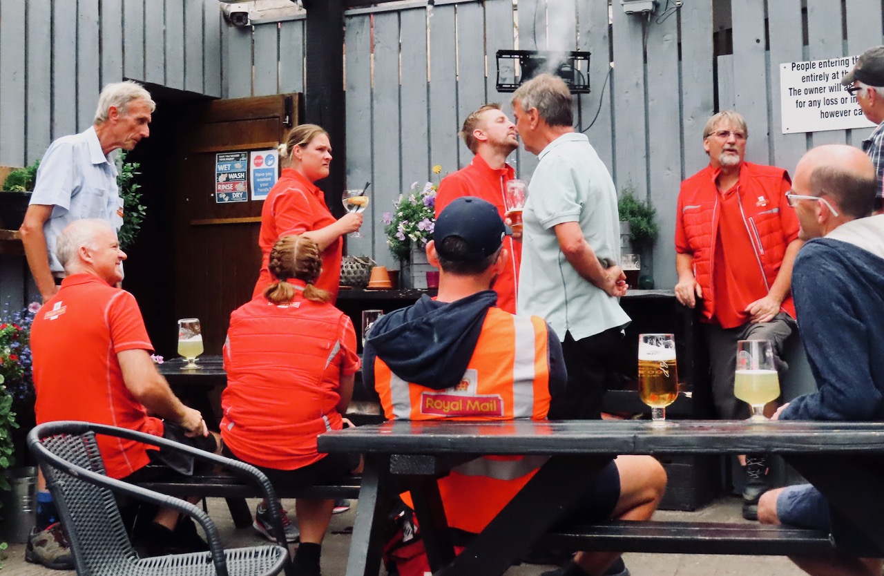 After several days of inanimate objects it was time to put some people back on the blog and the choice today was between two groups of roughly similar size, dressed in red, celebrating something. I could have gone with the footballers of Campion FC who were witnessed winning the ‘Yorkshire Trophy’, a pre-season warm-up tournament but they put in the effort. However, let’s instead go with this one of these postal workers, clearly celebrating the end of their working week in the Rose & Crown pub opposite the main sorting office in Cleckheaton. And they put in the effort too, all the time in fact.