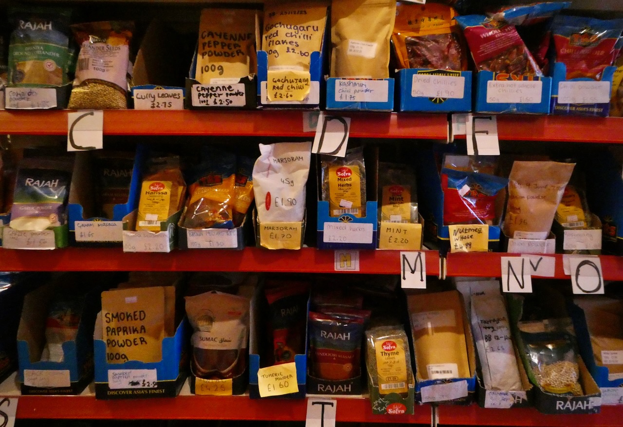 Joe bought me a book of Indian-style recipes for Christmas. I wanted to try some tonight, but many of the more obscure spices that were suggested were beyond my kitchen’s existing remit. But we have a very good Asian food store in Hebden Bridge. Now I know what curry leaves and tamarind actually look (and smell) like. Nigella seeds proved beyond everyone, however.