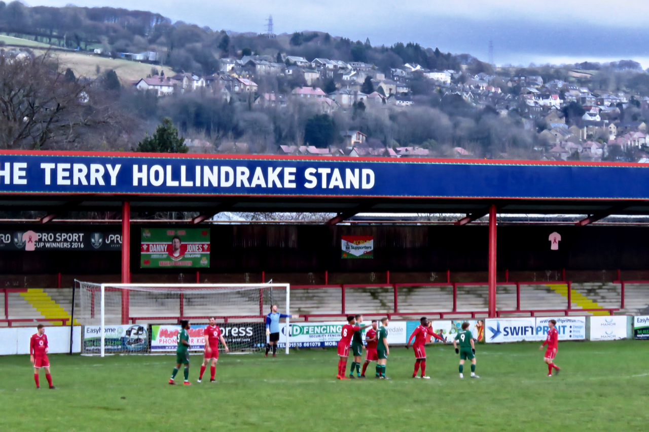 I pick this shot for the colour palette mainly — the blue of of his jacket works very well. It is taken from inside the ground, as the reversal of the lettering makes evident. As you can also see — it is raining, a lot. But the game behind me did manage to reach a conclusion. Nothing to do with Keighley Cougars, a rugby league club (you have never seen rugby league depicted on here, and unless I radically change in my remaining years, you never will) — the owners of that club decided they fancied a football team as well so simply bought one, Eccleshill United of Bradford, and teleported them here for as long as they feel like dabbling in another mode of football.