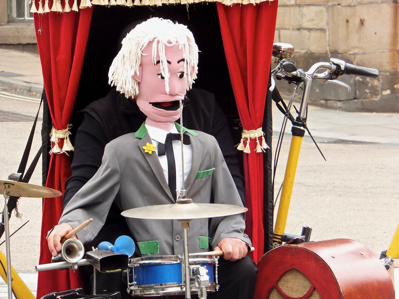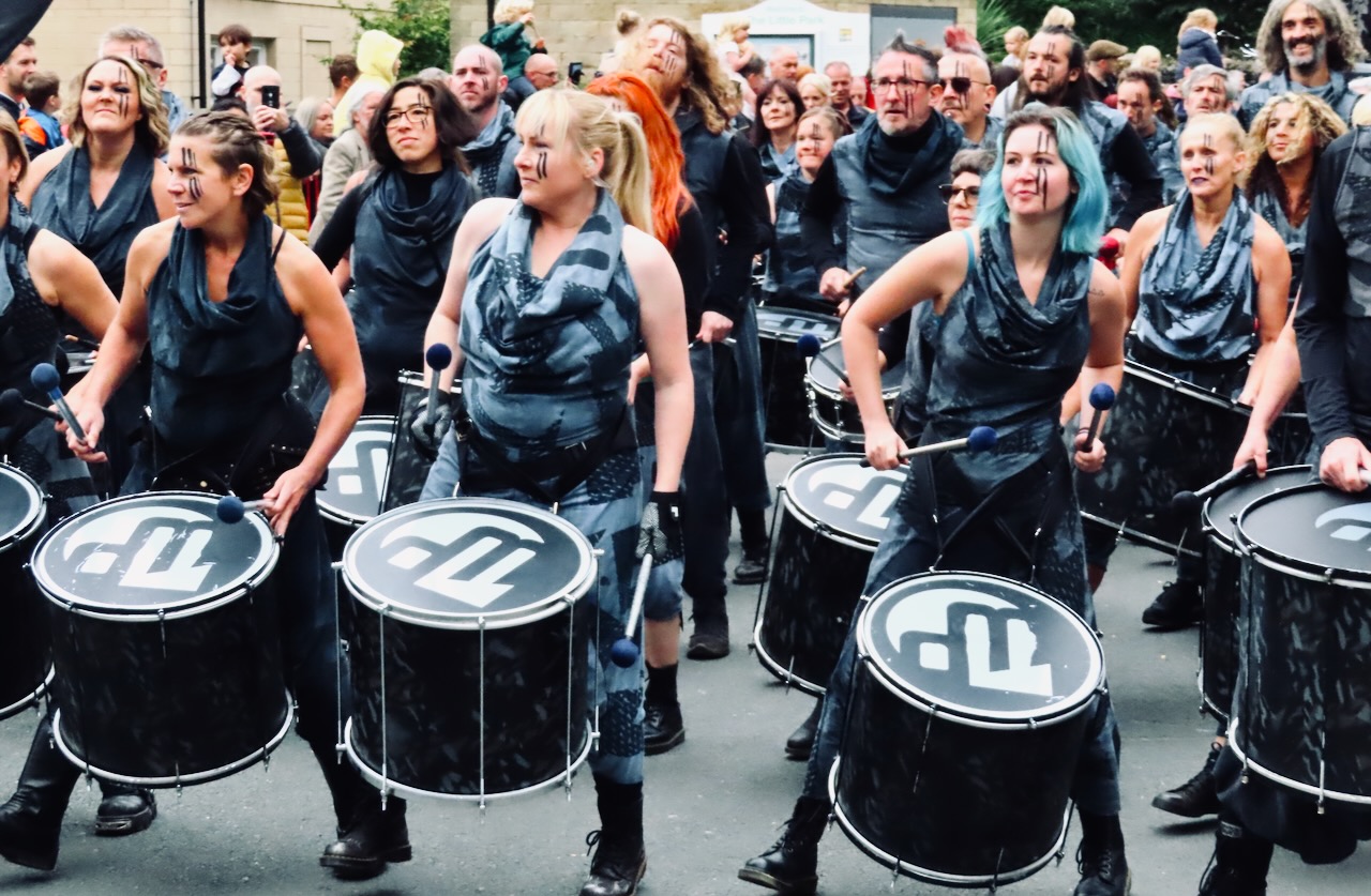 Welcome back to the Hebden Bridge Handmade Parade, which graced this blog on an annual basis before being cancelled in 2020 and 2021: one might say, ‘understandably’, at least for 2020, although I would disagree. But let’s move on from that and enjoy the present incarnation: shifted to September, seemingly smaller, but still with plenty of percussion. I like the way this shot captures the drummers concentrating both on their instruments and on the ‘conductor’ walking in front of them — as any good orchestra should. ‘Drum Machine’ is the name of this troupe, by the way.