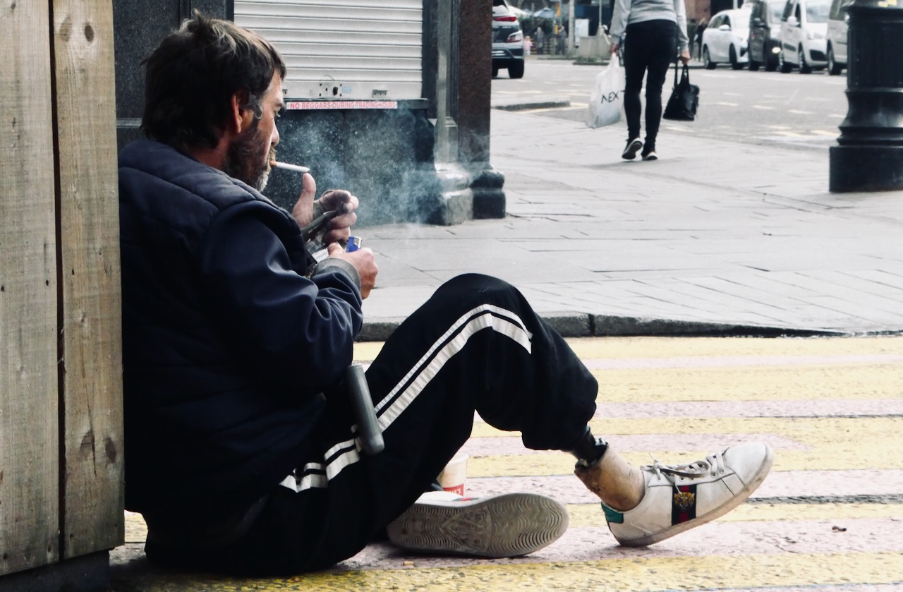 I’m as satisfied with this portrait as I can be. Important elements come together: the woman walking past; his ankle (and what it implies); the just-lit cigarette.