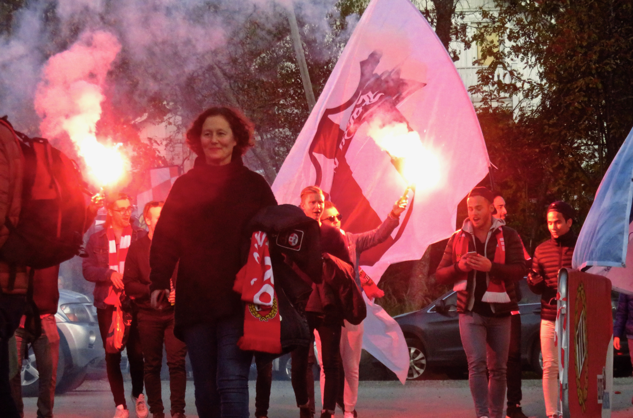 An excuse to see friend Doug, and have him make his sixth appearance on the blog, provided by the fact that Oldham Athletic (known as the Latics) were playing in Halifax, and D. can be minded to raise it for the Latics now and again. The Three Pigeons lies between railway station and ground and is rather obligatory on such occasions (see also here, for instance, which I’m pretty sure is exactly the same table). I like this one thanks to the brightness of the guy behind, who interrupts the dark line of people quite agreeably. It finished 1-1, by the way.