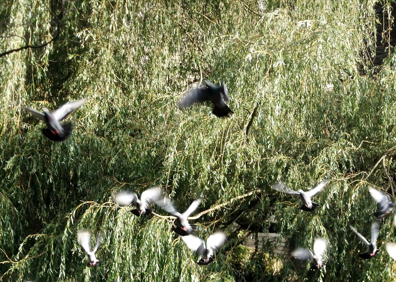 Some pictures you just take by chance. This was supposed to be a picture of some workmen, and they’re still there in the invisible three-quarters of this significantly cropped image, but as I took it, this flock of pigeons flew across. It’s not a bad shot, though the birds are quite blurred and that branch that goes across the lower centre of the picture unbalances it a bit. But though I took some other nice pix on what was a pleasant morning here, with all the others, I could probably take them again. A shot like this may only happen once, so I’m nominating it for today.