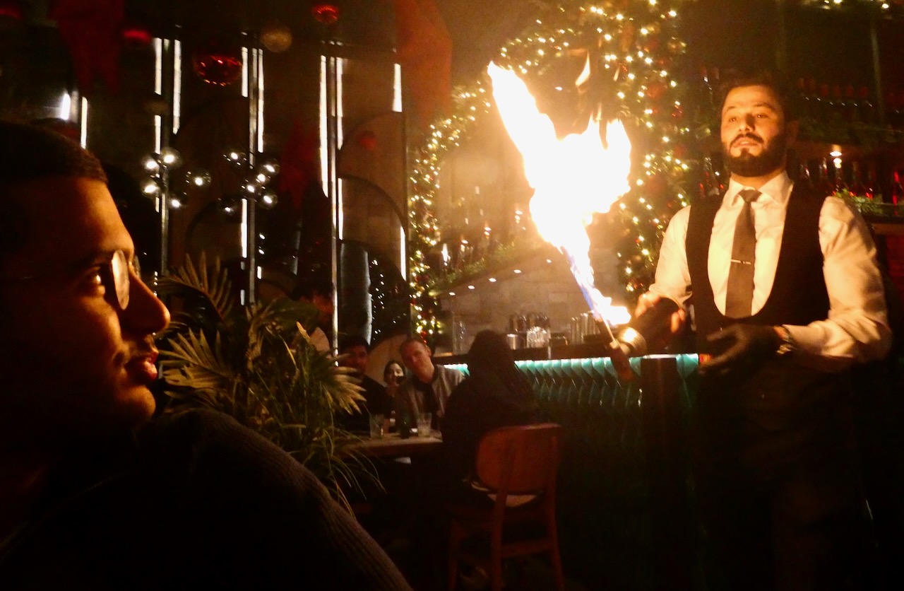 My PhD student of the last five years, Sara, passed her viva voce examination today — with only minor corrections, a very good result (for a good thesis, I honestly did think) — and so took me out to dinner at a Turkish restaurant in Manchester. The place’s waiters definitely had an overblown sense of theatrics. Salman, Sara’s son, looks somewhat apprehensively at one of them striding towards us with the kind of flamethrower that, if carried outside, would probably see him arrested for branding an offensive weapon. All this just to put a second or two of extra charring on the spicy meatballs. Food was good, though.