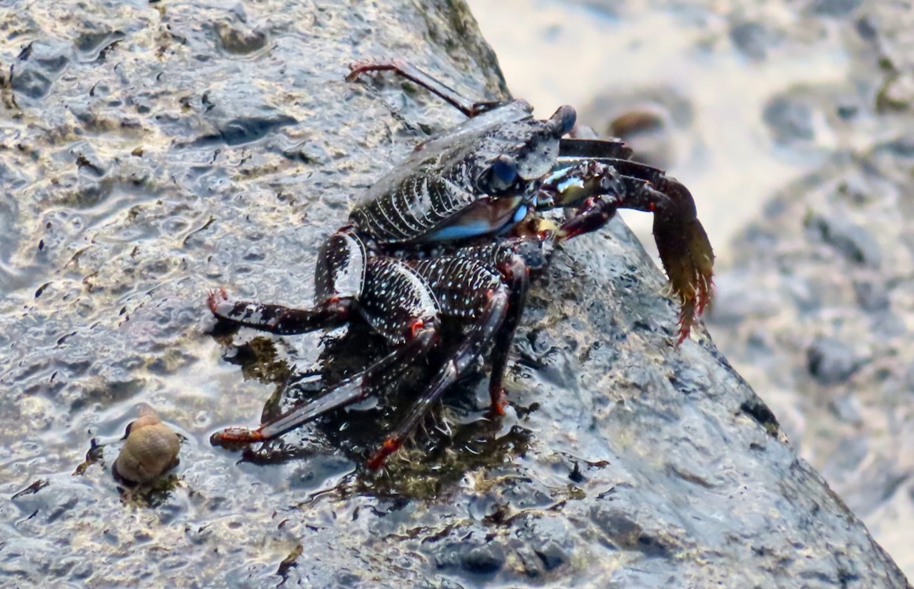 Jamestown is one of only three places on St Helena where it is fairly easy to get down to the sea, and that is where I was standing at the end of my day’s work when I looked down and was faintly revolted when a whole sqaudron of these little black crabs scuttled out from just below me and headed for the water. They looked rather plain and black from above but I got the camera out anyway. On uploading the pictures it was pleasing to see the detail on this one, the spots, the red and the blue. Perhaps there is beauty in all things. (Except jellyfish, which really are disgusting.) This specimen can become the first of its biological order (Brachyura) to make the blog.