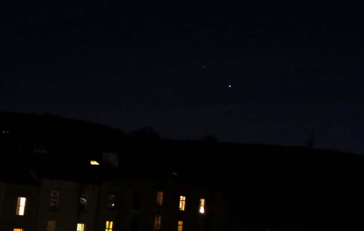 Mondays have hardly been the most exciting days recently, even by present standards. But while, in no way, a decent photograph aesthetically, this is at least interesting. What you see here are Jupiter (the brighter one) and Saturn setting over Hebden Bridge, seen from my home. I did not realise this until today but apparently these planets are almost due to touch (from our perspective) on 21st December; the closest apparent conjunction since 1623. One to look out for, if you have any interest in astronomy.