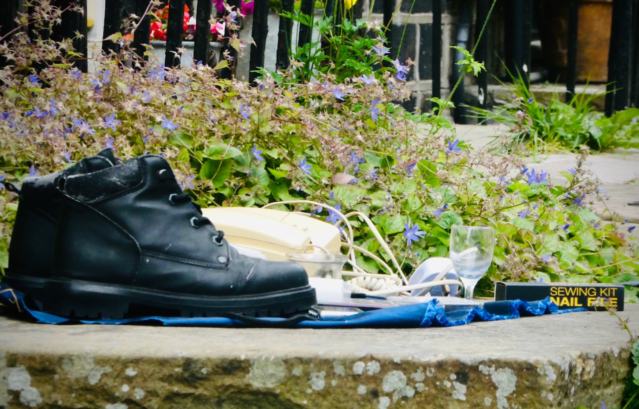 Not quite the latest pic in the ‘abandoned shoes’ series, as there is a pair here. Along with the other items they seem to have been placed beside the Keighley Road pavement deliberately, for collection and subsequent use by anyone who needs them. So if anyone in Hebden Bridge does want an old telephone, a plastic wine glass, a nail file, the shoes or the other things which were in the pile but unseen — feel free to go and inspect.